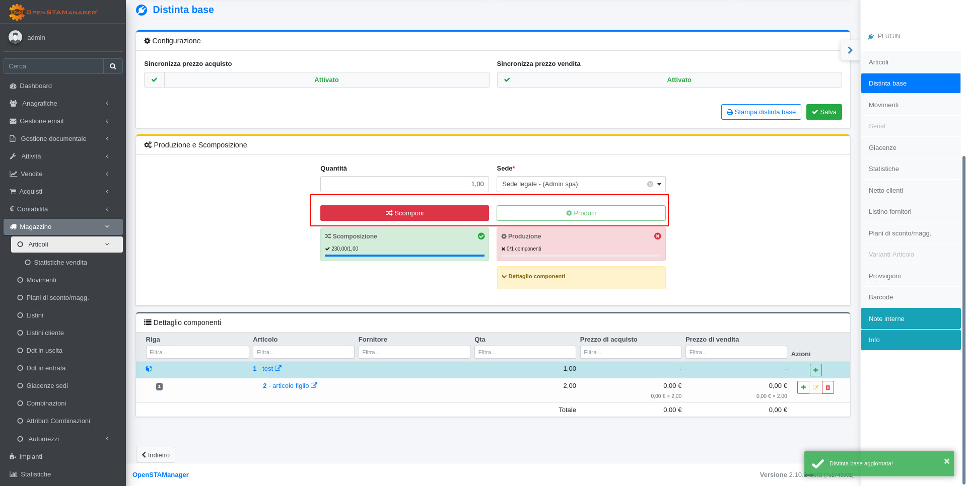 Il plugin Distinta Base offre le seguenti funzionalità principali:
