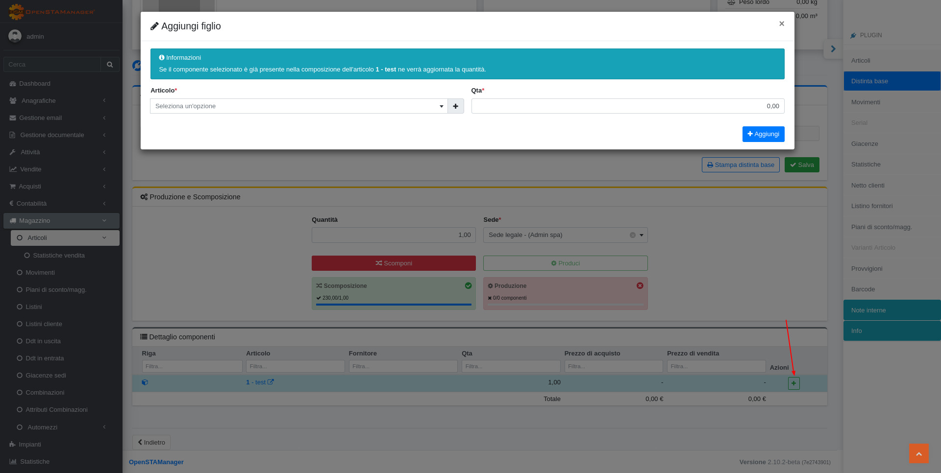 Cliccare sul plugin "Distinta base" nella colonna destra