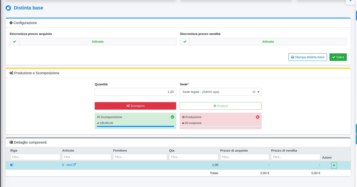 Sincronizza prezzo acquisto: Se abilitato, il prezzo di acquisto dell'articolo padre viene aggiornato automaticamente in base ai prezzi dei componenti