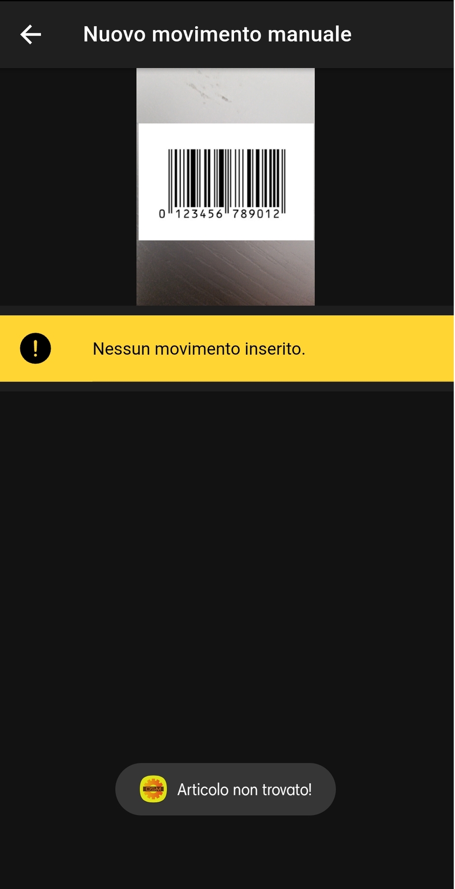 Nel caso in cui il barcode rilevato non sia collegato a nessun articolo registrato a magazzino verrà visualizzato l'avviso Articolo non trovato!