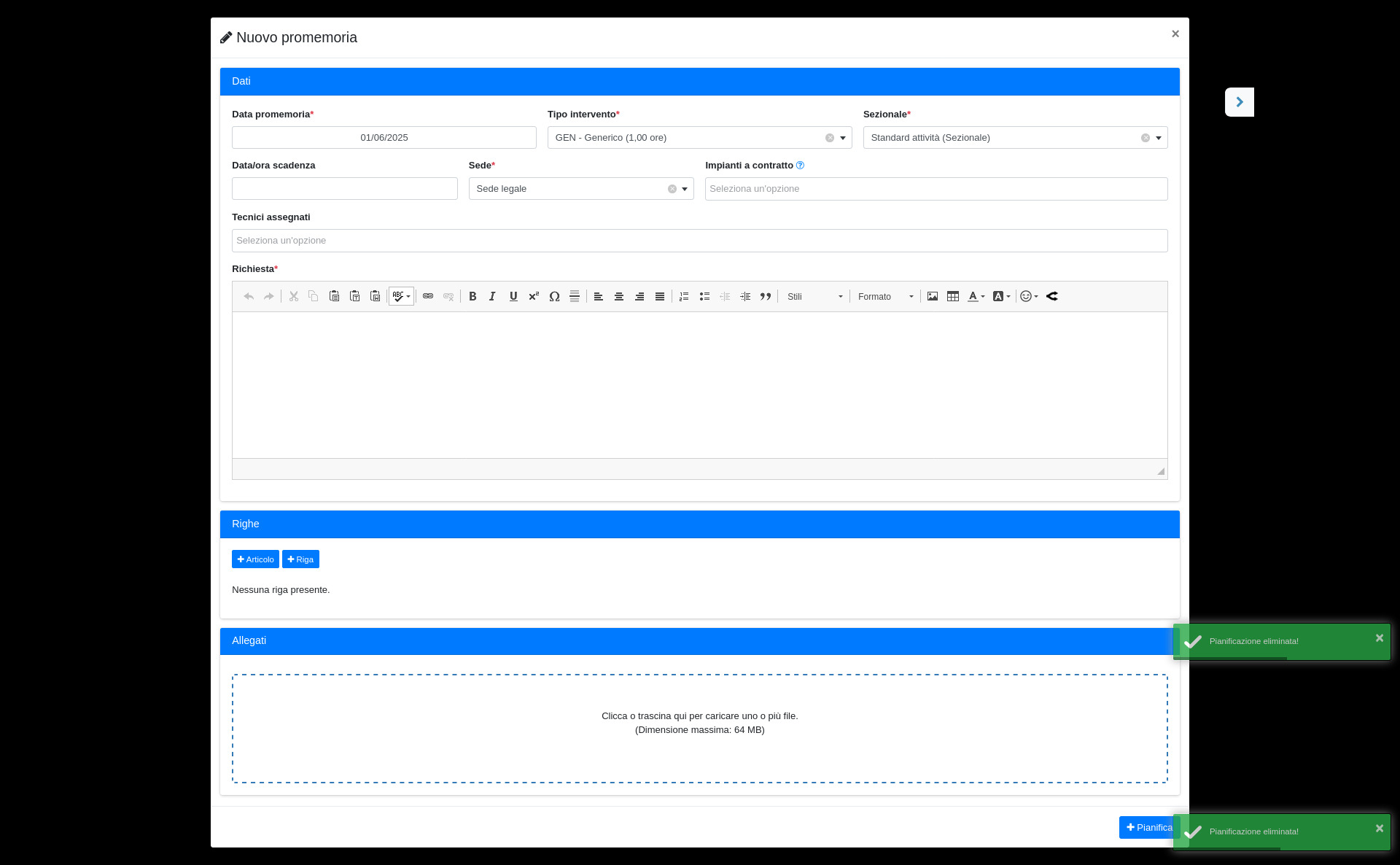 Per poter correttamente creare le sessioni di lavoro e visualizzare le attività pianificate in Dashboard, è necessario che il campo Tecnici sia valorizzato.