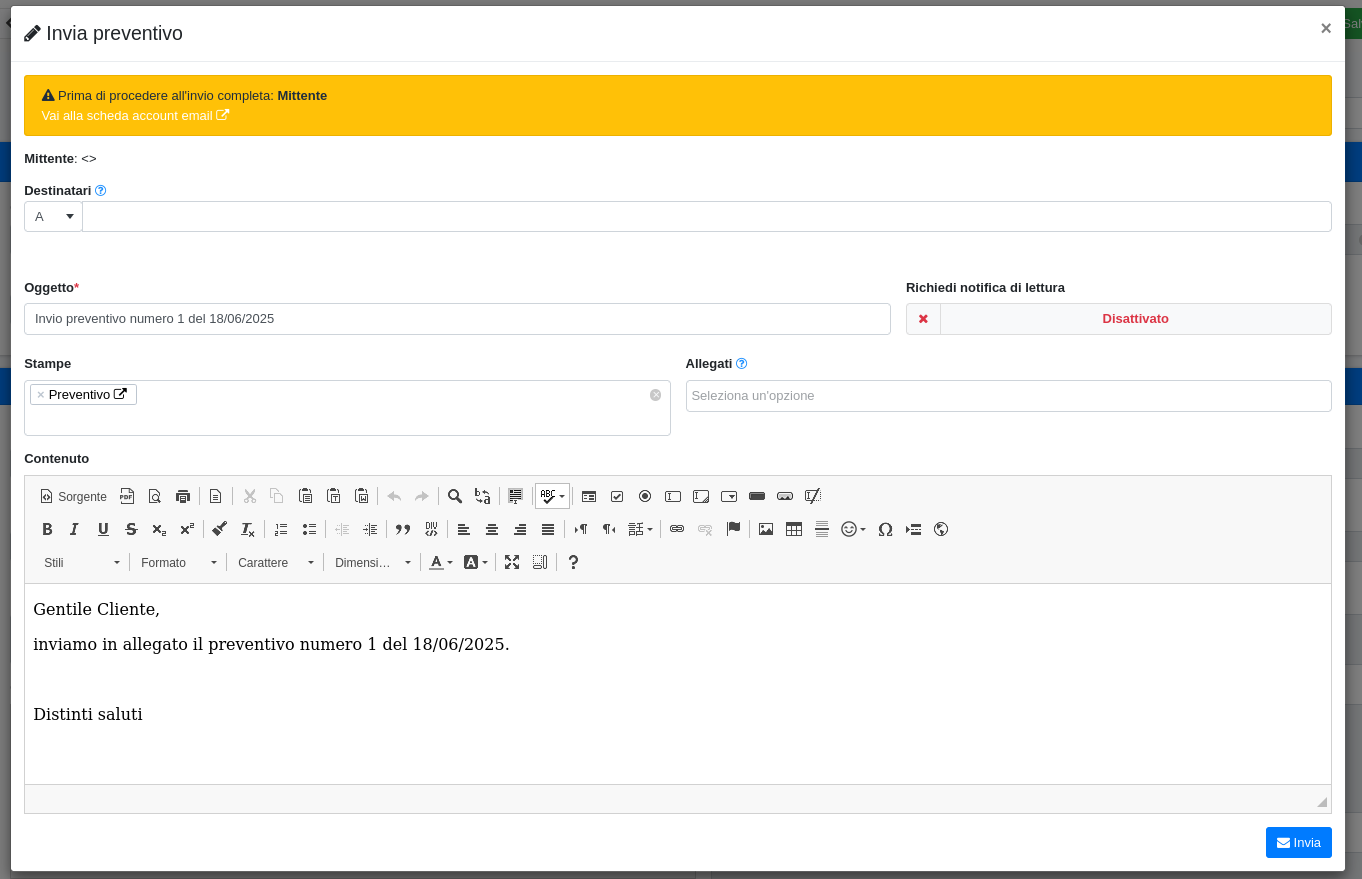 Cliccando sul tipo di documento da inviare si verrà indirizzati al template email compilato con i dati dell'attività, dove sarà possibile inviare la mail cliccando su Invia.