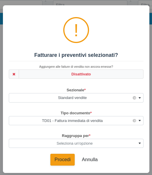 Per poter fatturare massivamente dei preventivi, devono essere in uno dei seguenti stati: Accettato, Rifiutato, In lavorazione, Concluso, Pagato o Parzialmente fatturato.