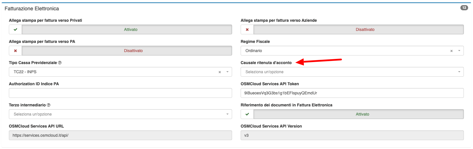 Per poter procedere alla corretta emissione di una fattura con ritenuta d'acconto si dovrà inoltre specificare la **Causale ritenuta d'acconto** in Impostazioni/Fatturazione elettronica, che andrà a compilare il campo \<CausalePagamento> in fattura elettronica.