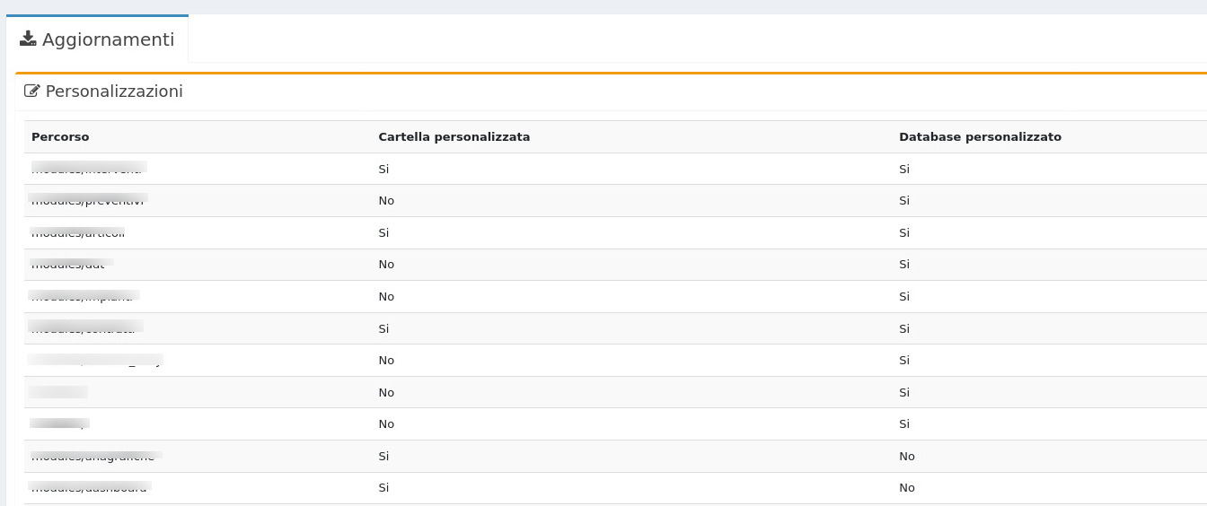 Nel caso siano presenti personalizzazioni, esse verranno elencate nella parte superione della pagina in Strumenti/Aggiornamenti.