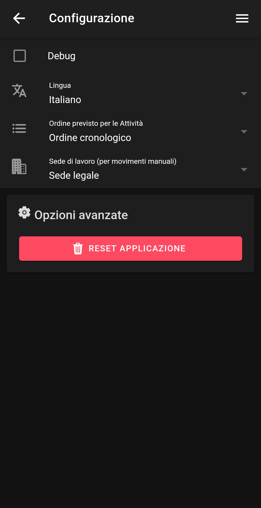 Per poter rendere effettiva la modifica di ognuna di queste impostazioni è necessario resettare l'applicazione tramite apposito pulsante Reset applicazione e rieffettuare il login.