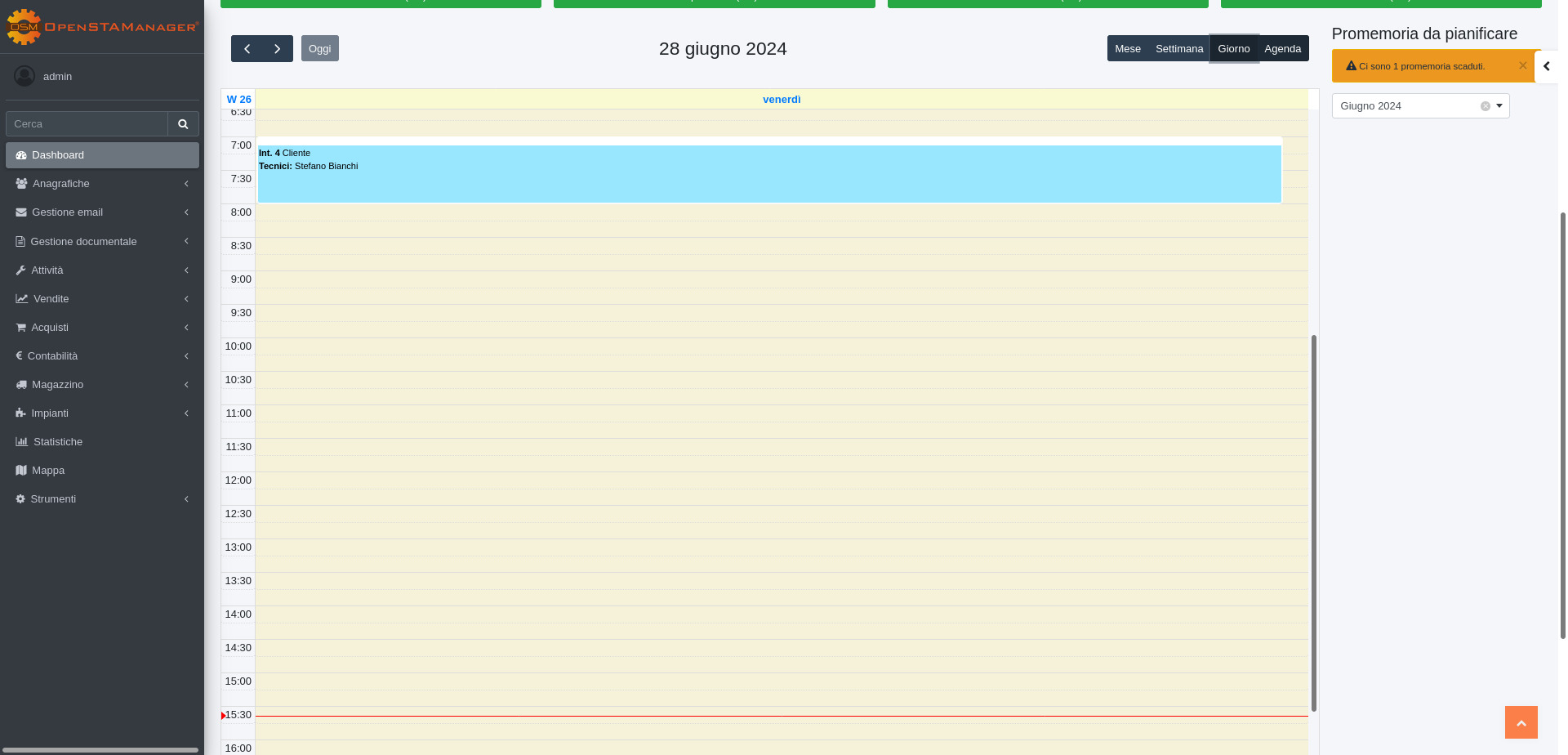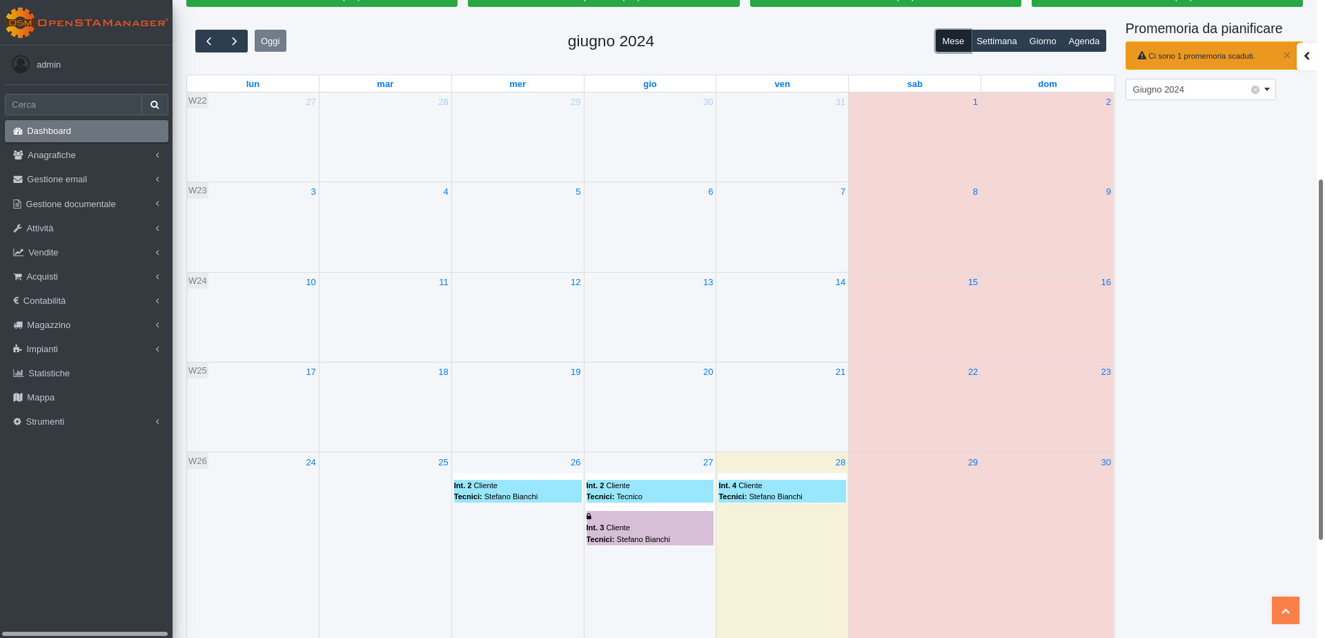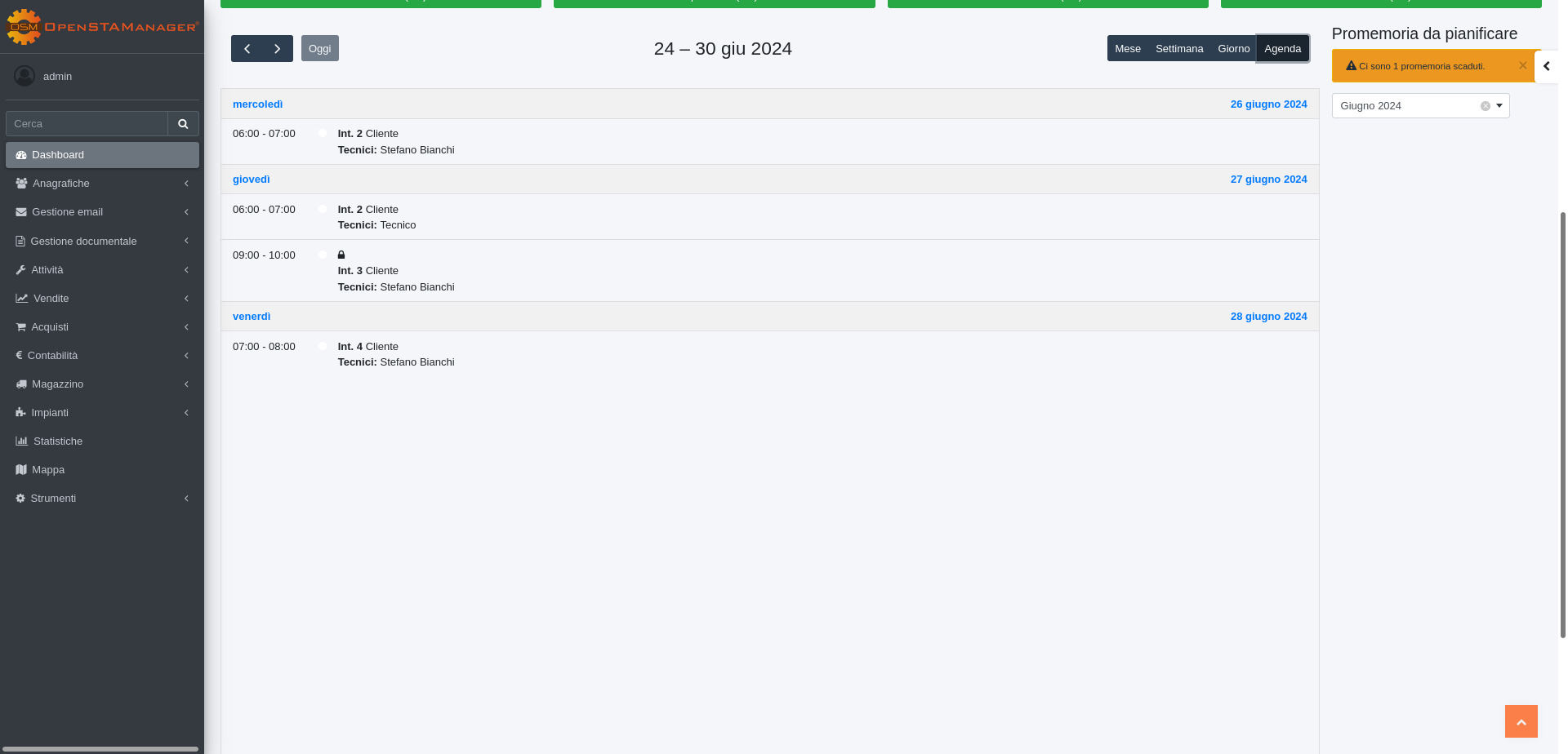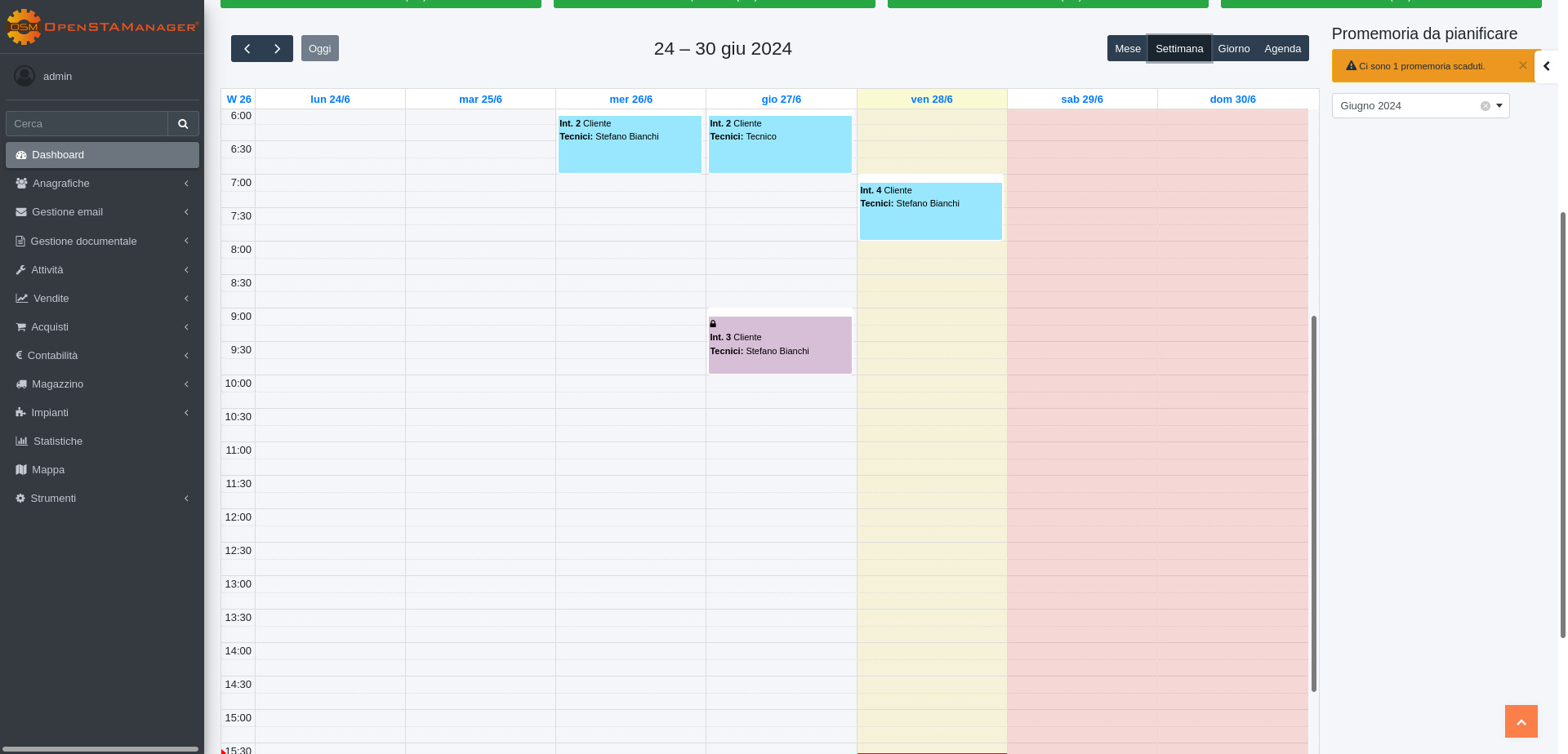 I promemoria da pianificare sono visualizzabili solo agli utenti rientranti nella categoria amministratore e al relativo tecnico assegnato.