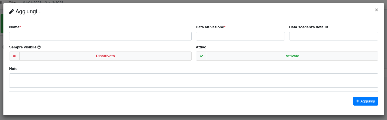 Da qui si potrà definirne il nome e le date di attivazione e di scadenza, selezionare se si vorrà visualizzare sempre e se impostarlo come Attivo o Disattivo.