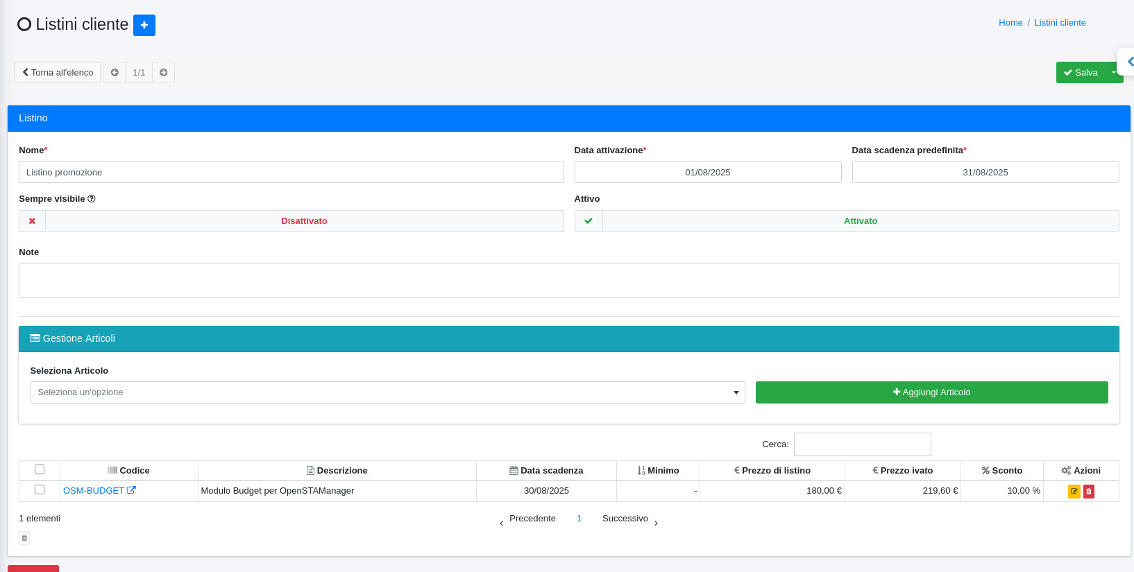 Il modulo **Listini cliente** permette di registrare dei listini definendone la validità e gli articoli coinvolti.