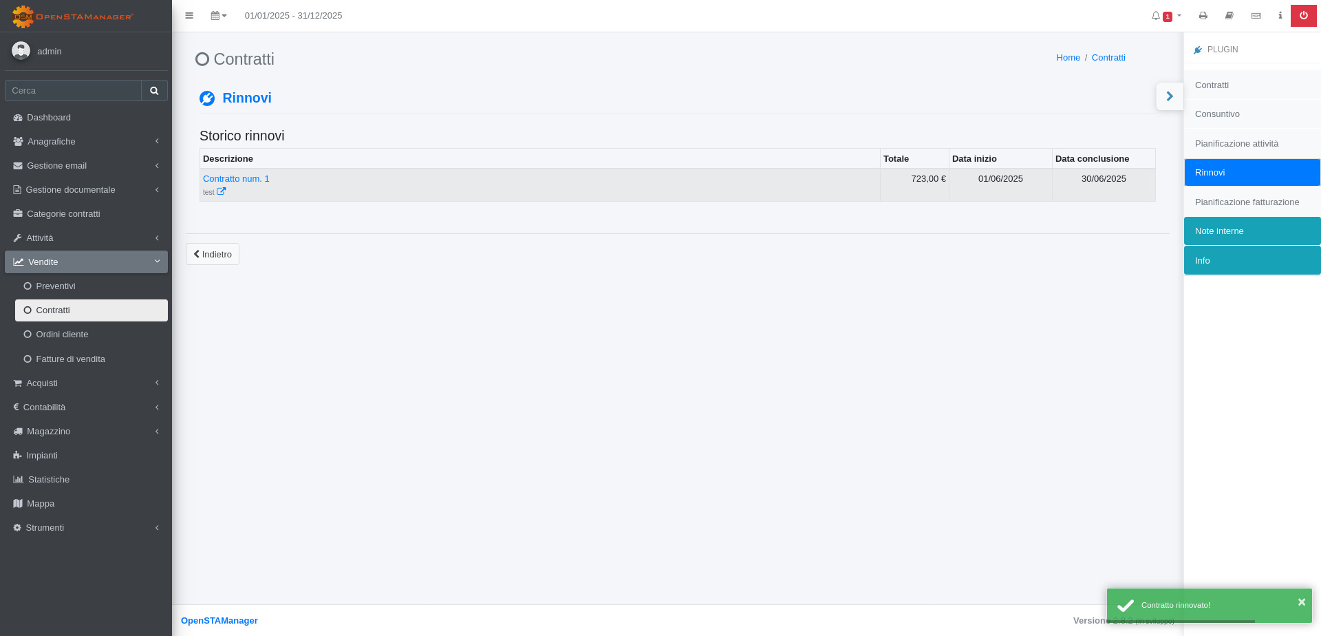 Le impostazioni relative ai rinnovi dei contratti sono state spostate nella schermata di edit del contratto, da questo plugin è possibile visualizzare lo storico dei rinnovi collegati al Contratto.