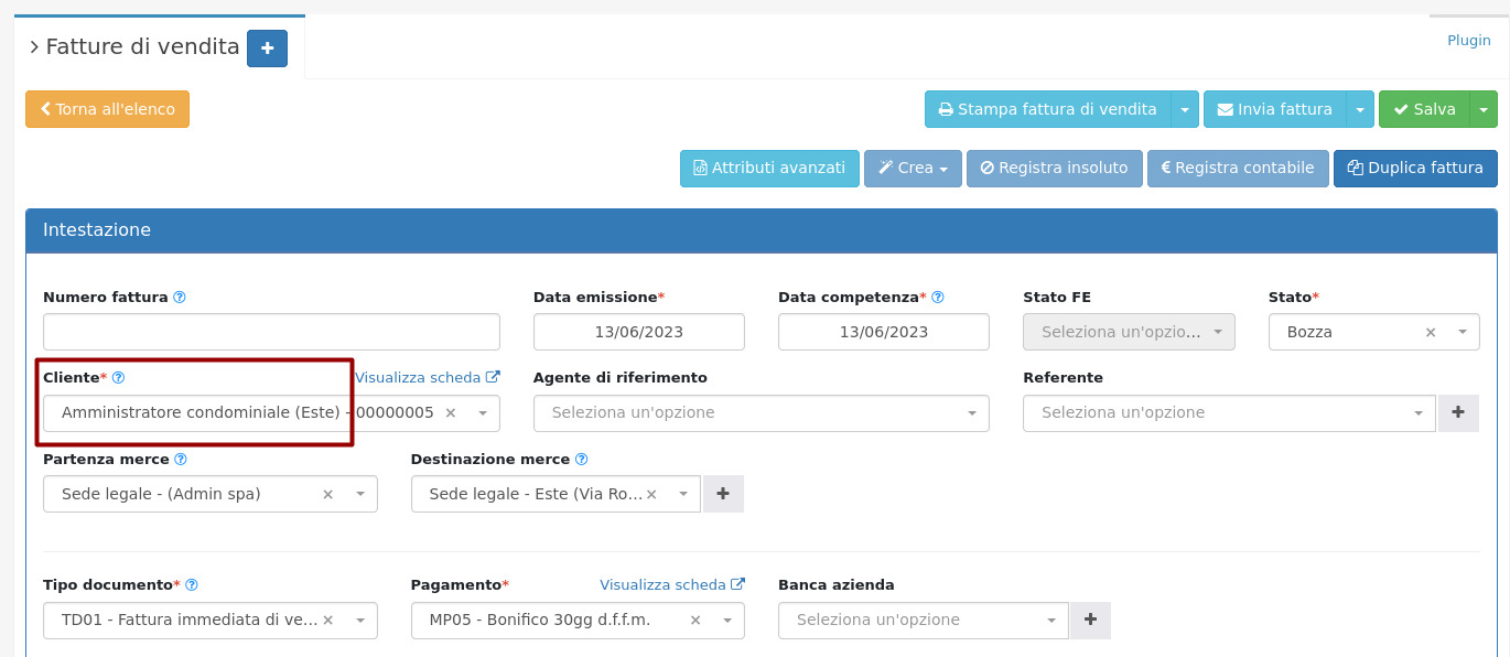 Verrà quindi creata una fattura con i dati dell'anagrafica inserita nel campo 'Per conto di', che sarà l'intestatario della fattura, incaricato al suo pagamento.