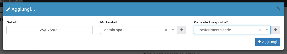 Da qui si dovranno ora specificare la sede di partenza e di arrivo della merce, e inserire come righe gli articoli da spostare.