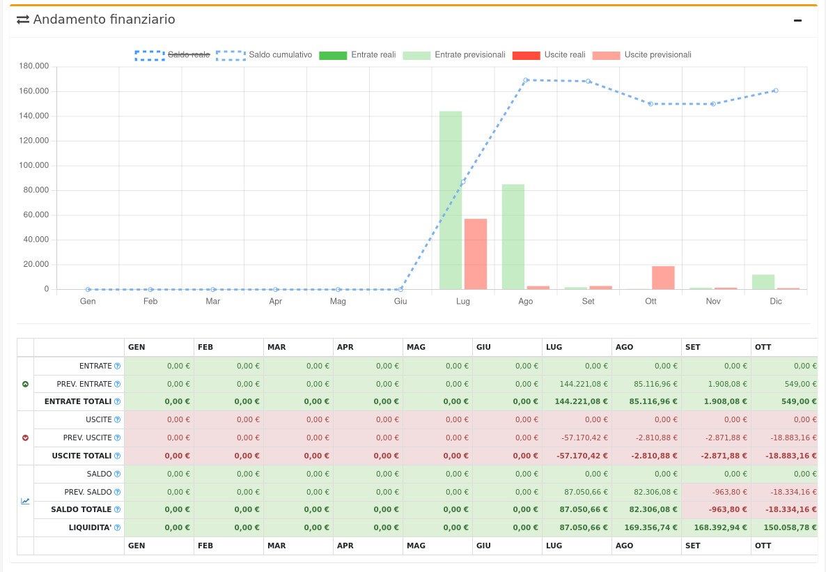 L'andamento finanziario, a differenza di quello economico, attinge dati anche dallo scadenzario, e va quindi ad imputare tutte le scadenze previste nel relativo periodo di competenza.