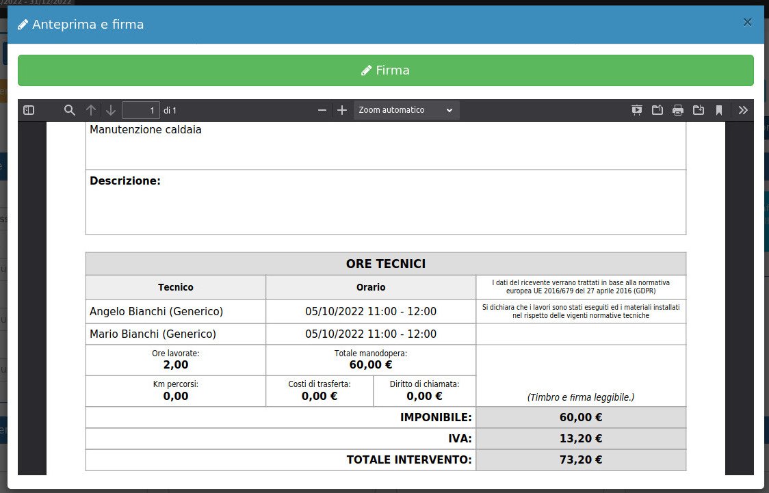 Cliccando su un intervento nel calendario è possibile accedere alla sua schermata di dettaglio, da dove è possibile apportare modifiche, stamparne le specifiche, inviare il rapportino e la notifica di presa in carico, e accedere al pannello di anteprima e firma.