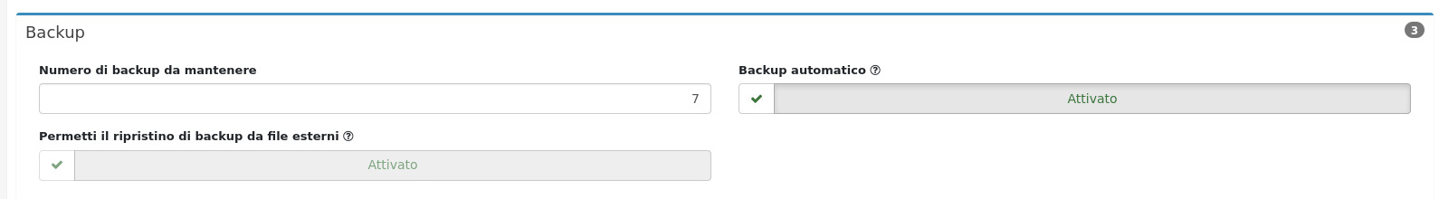 Il backup presenta alcune impostazioni configurabili dall'utilizzatore in relazione alle operazioni di backup automatico e al percorso di salvataggio dei backup stessi.