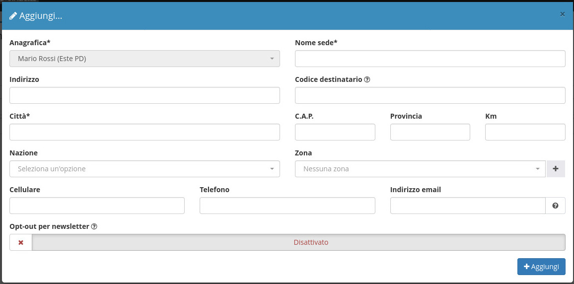 Viene quindi reso possibile compilare tutte le informazioni di base relative alla nuova sede da creare: