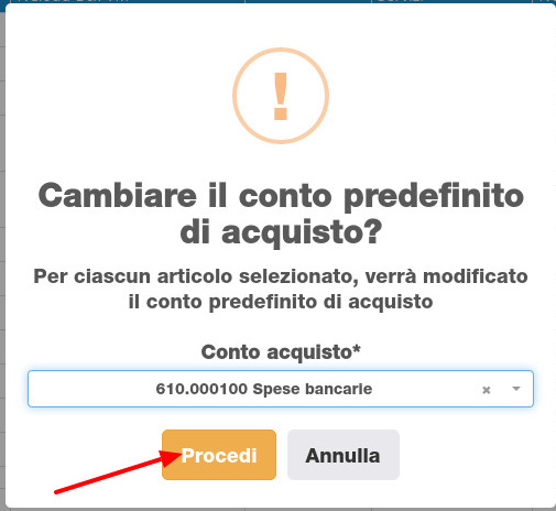 Una volta selezionati i record interessati è possibile modificarne massivamente il conto predefinito di acquisto cliccando su Azioni di gruppo/Aggiorna conto predefinito di acquisto.