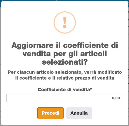 Il gestionale chiederà ora il coefficiente di vendita da applicare agli articoli, fare clic su Procedi per confermare.