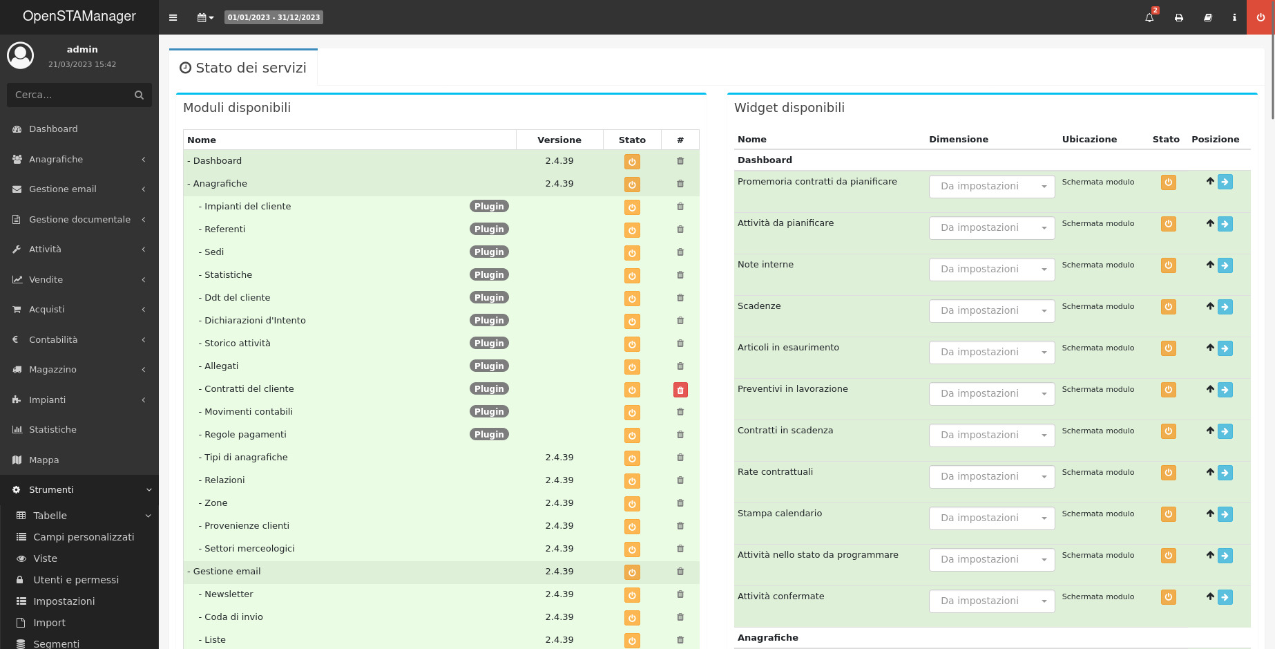 Nel modulo Stato dei servizi è possibile abilitare e disabilitare i moduli e i plugin di OpenSTAManager.