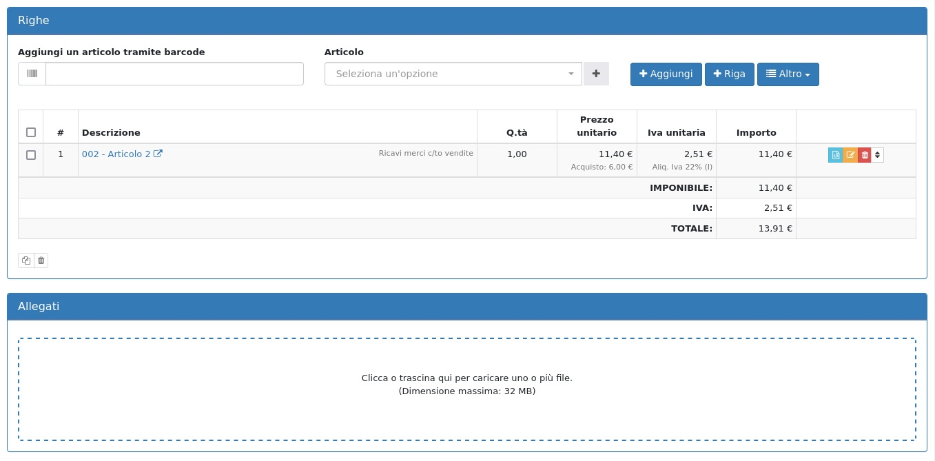 E' possibile intervenire massivamente sulle righe dei documenti selezionandole e ricorrendo alle azioni di gruppo:
