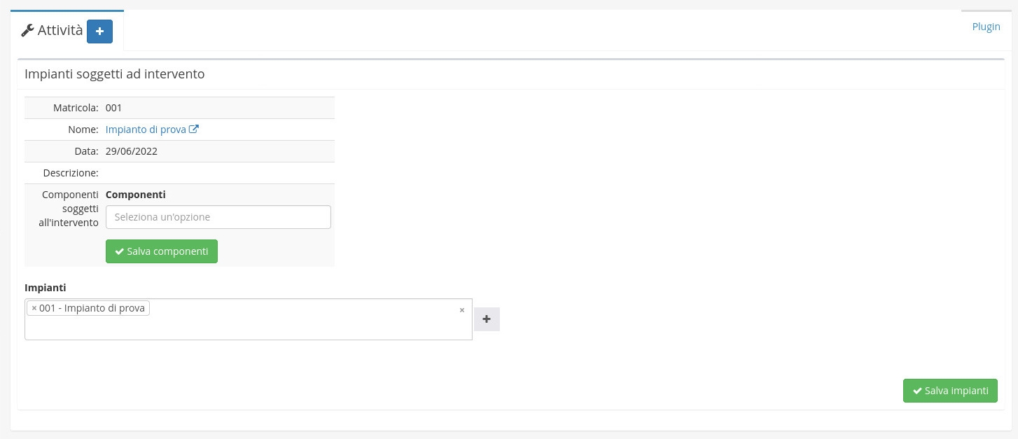 Da questa schermata è possibile selezionare uno o piu impianti da assegnare all'attività, o eventualmente procedere a crearne uno al volo.