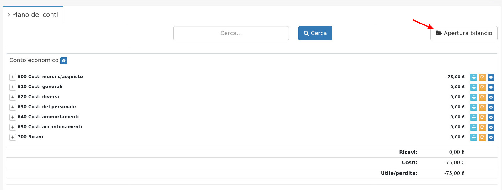 Da questo modulo è possibile visualizzare il piano dei conti, diviso in Conto economico e Stato patrimoniale.
