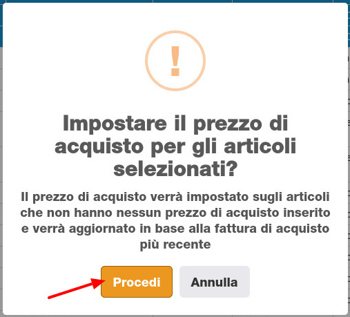 Il gestionale chiederà quindi la conferma a procedere all'aggiornamento dei prezzi di acquisto.