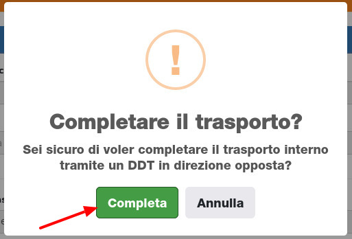 Una volta effettuato il trasferimento e impostato il DDT come evaso, si dovrà andare a registrare lo stesso DDT con direzione opposta. Sarà possibile registrare questo DDT direttamente da questa schermata cliccando sul tasto Completa trasferimento tra sedi.