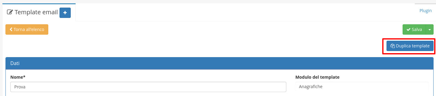 È inoltre presente il pulsante Duplica template che permette di duplicare un template precedentemente creato.