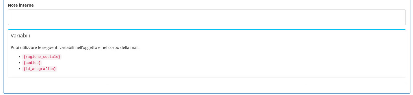 Tra questi campi, Contenuto e Oggetto prevedono un sistema di autocompletamento per alcuni particolari valori definiti dal modulo. L'elenco completo di questi elementi viene reso disponibile nella sezione informativa Variabili.