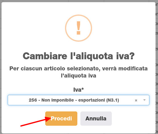 Il gestionale chiederà ora l'aliquota IVA da applicare agli articoli selezionati.