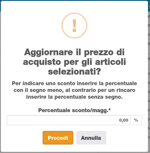 Il gestionale chiederà ora il coefficiente di vendita da applicare agli articoli, fare clic su Procedi per confermare.