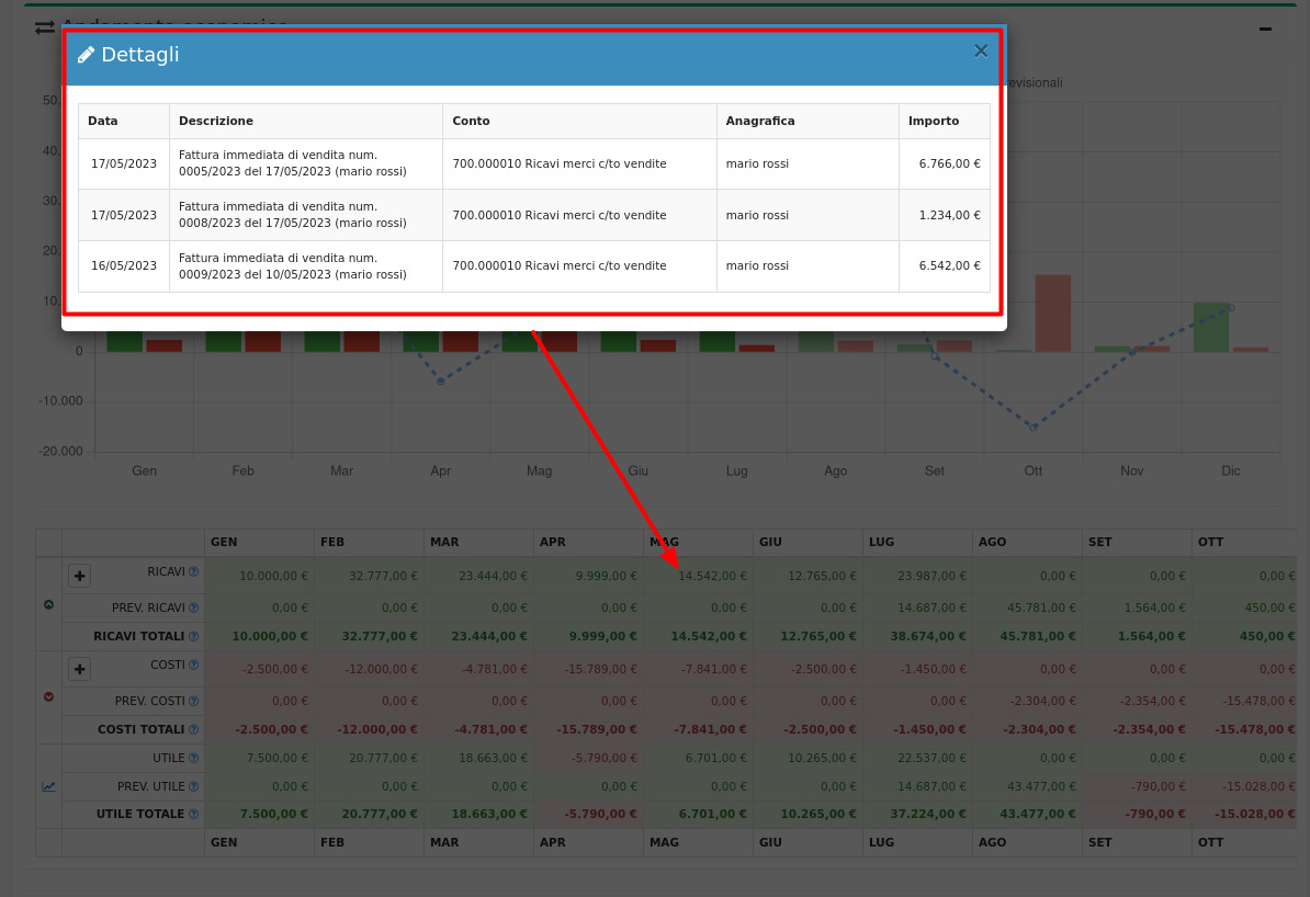 Volendo analizzare nel dettaglio tutti i documenti che concorrono a costituire il valore di entrate e uscite, è possibile cliccare sull'importo interessato della tabella e si aprirà una schermata con i riferimenti alle diverse fatture.