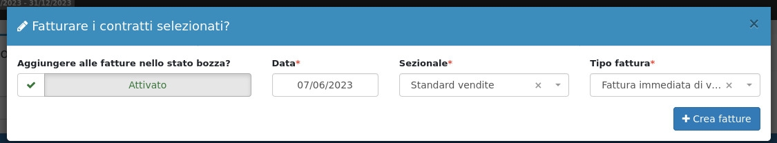 Volendo fatturare le rate manualmente, sarà sufficiente selezionare le rate interessate e cliccare su Crea fattura. Da qui sarà possibile selezionare se accodare le rate selezionate a fatture della stessa anagrafica in stato Bozza, e modificare la data, il sezionale e il tipo di fattura.