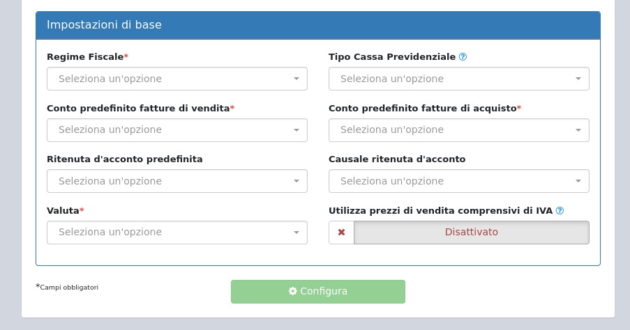 Andranno qui immesse le informazioni base dell'azienda per effettuare il primo accesso, suddivise in: