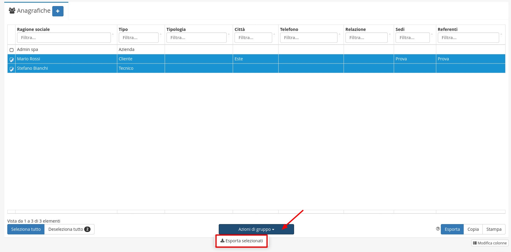 Il modulo Anagrafiche permette di esportare massivamente le anagrafiche selezionandone le checkbox a inizio riga e cliccando su Azioni di gruppo.