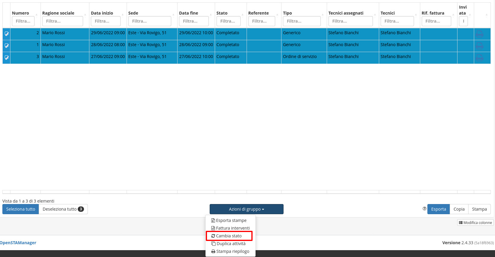 Una volta selezionati i record interessati è possibile modificarne lo stato massivamente cliccando su Azioni di gruppo/Cambia stato.