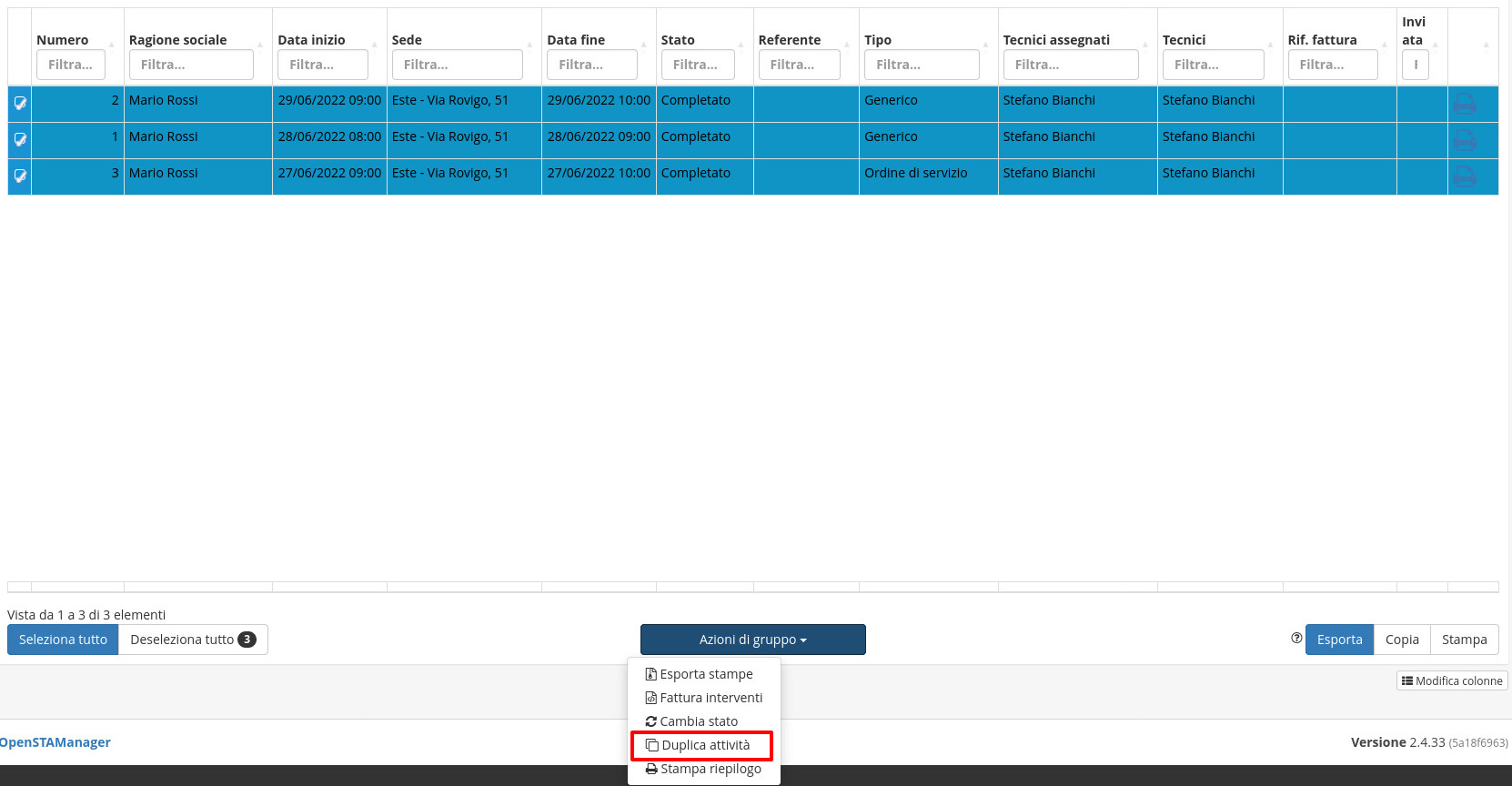 Una volta selezionati i record interessati è possibile duplicarli massivamente cliccando su Azioni di gruppo/Duplica attività.