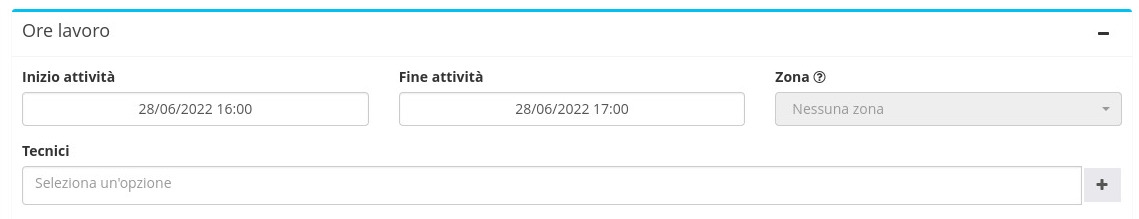 La sezione Ore di lavoro si occupa di determinare durata dell'attività e il tecnico assegnato, composto dai seguenti campi: