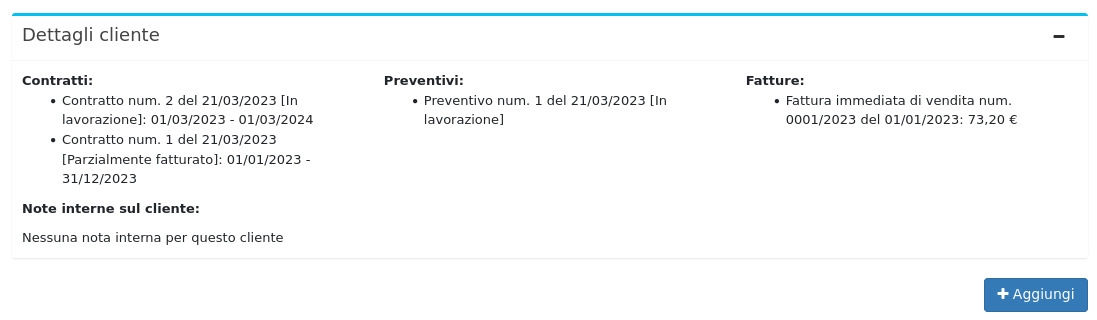 Nella sezione Dettagli cliente vengono visualizzati i Contratti, Preventivi e Fatture attivi per il cliente selezionato, e vengono visualizzate le note interne.