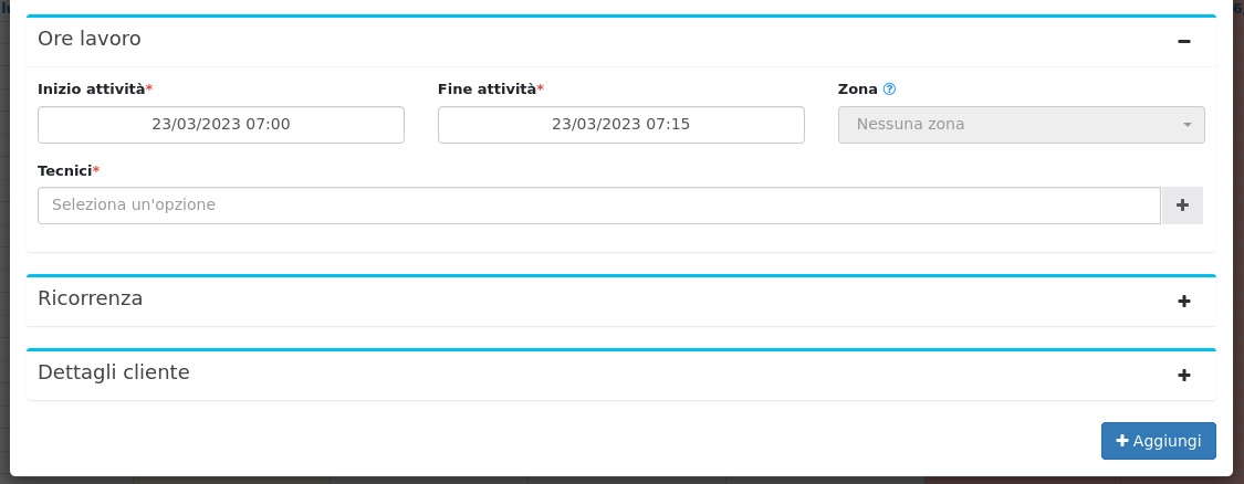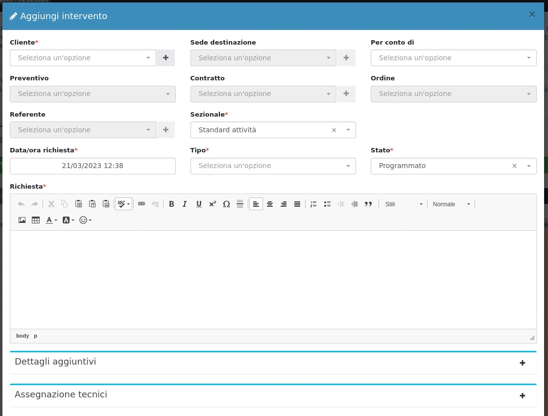 Creando un intervento in questo modo si hanno a disposizione una serie di campi obbligatori da compilare, quali: