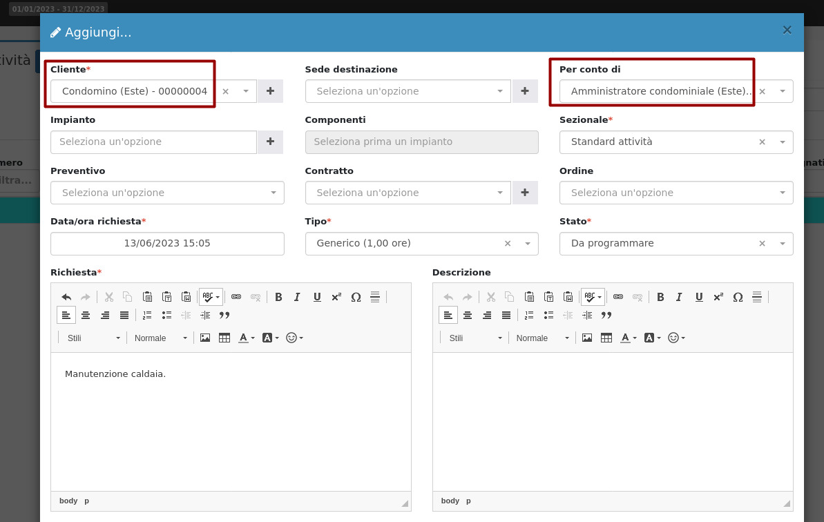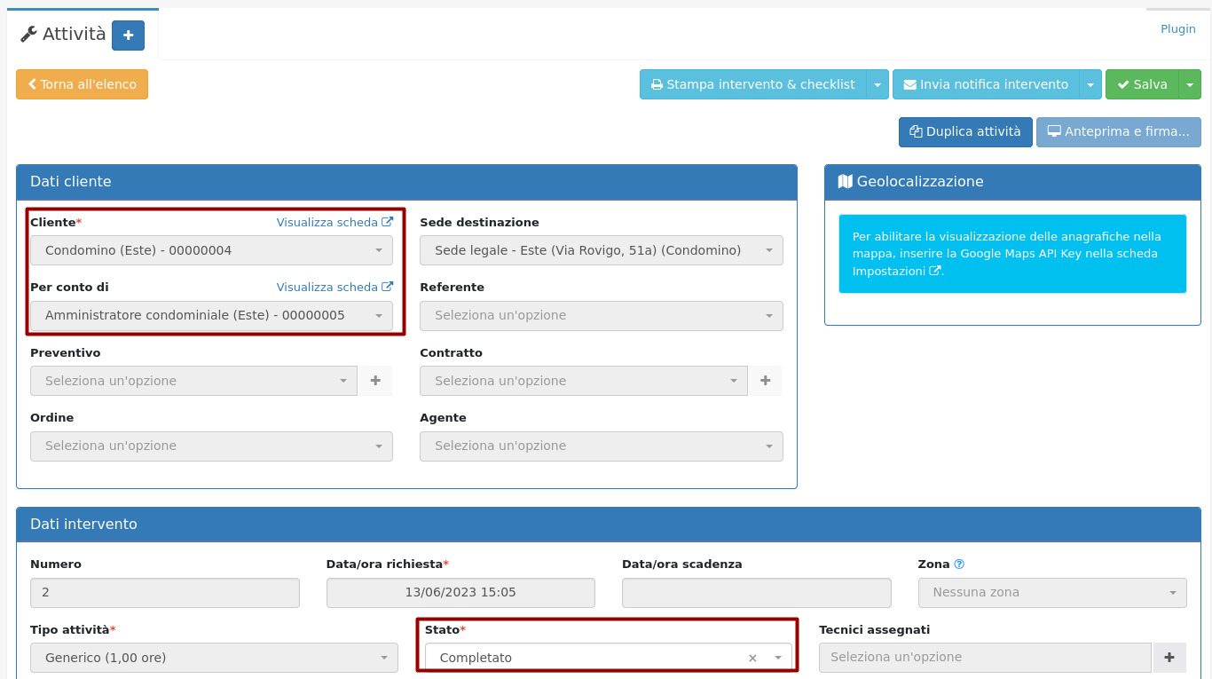 Ad esempio, nel caso di interventi di manutenzione eseguiti in un condominio dove il committente è il condomino ma a saldare la parcella sarà l'amministratore condominiale, si dovrà creare un'attività con il condomino come cliente, e valorizzare il campo 'Per conto di' con i dati dell'amministratore.