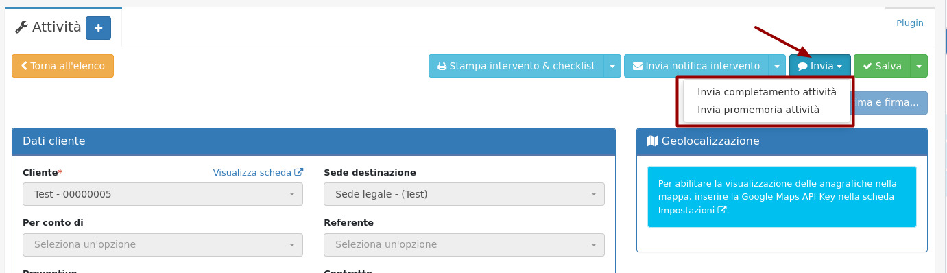 Il numero di telefono a cui inviare l'SMS verrà autocompilato con il numero presente nell'anagrafica cliente selezionata.