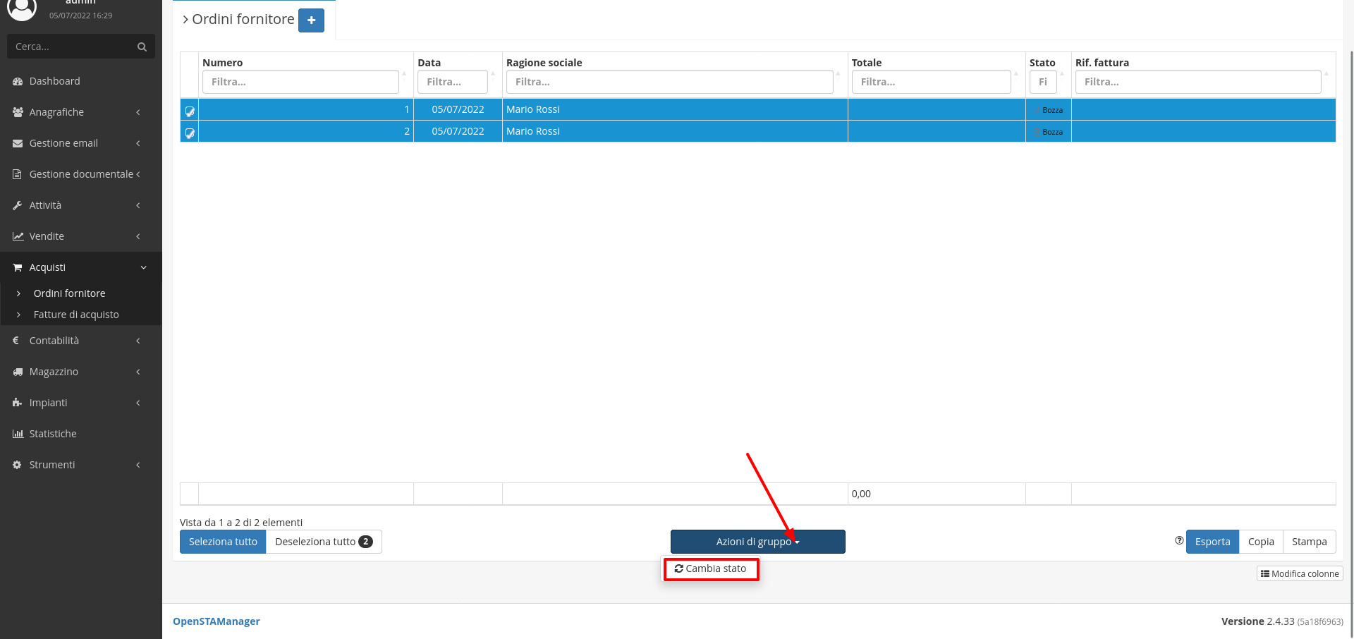 Il modulo Ordini fornitore permette di cambiare lo stato degli ordini massivamente dalle azioni di gruppo.