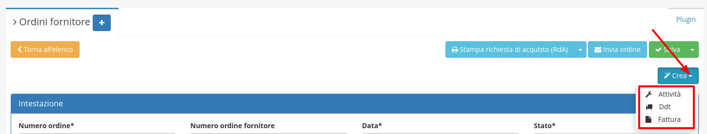 Dalla schermata di dettaglio di un ordine fornitore è possibile procedere alla creazione di documenti collegati ad esso: