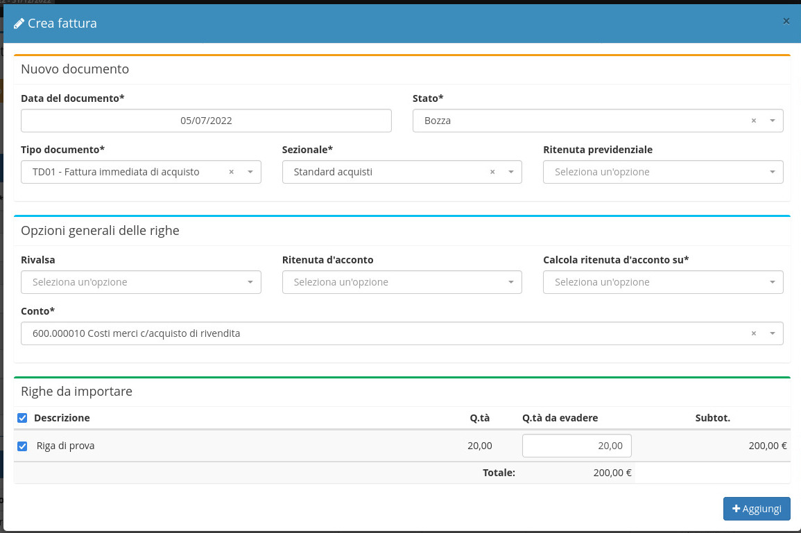 Nell'ordine fornitore deve essere presente almeno una riga, e lo stato deve essere impostato su Accettato.