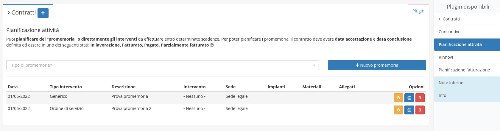 Il plugin Pianificazione attività è una componente del modulo Contratti dedicata alla completa gestione della pianificazione delle attività (promemoria) relative ai contratti registrati all'interno di OpenSTAManager.