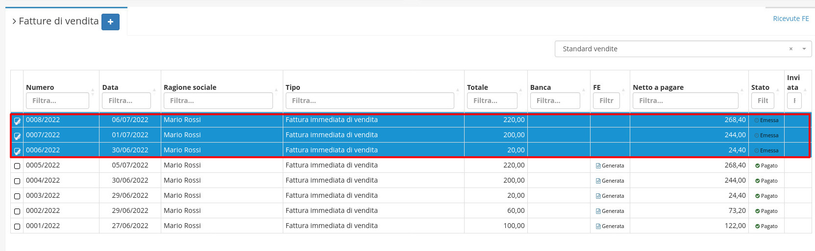 Si potranno ora vedere tra le fatture di vendita i record appena creati.