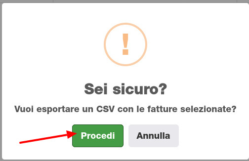 Il gestionale chiederà quindi la conferma di procedere all'esportazione in formato CSV delle fatture di vendita selezionate.