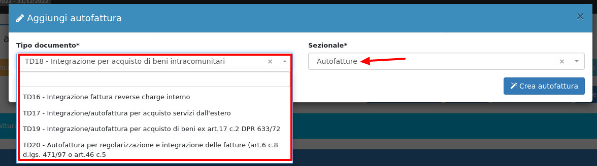 • "Autofattura Art.38 del DL n. 331/1993" per TD18